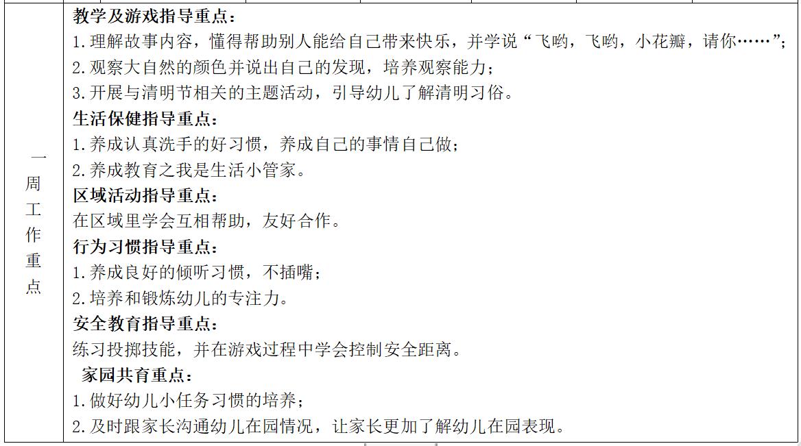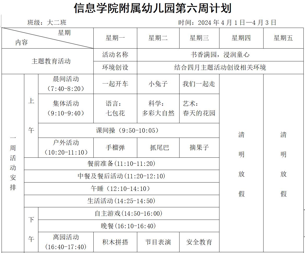 大二班第二学期第六周计划