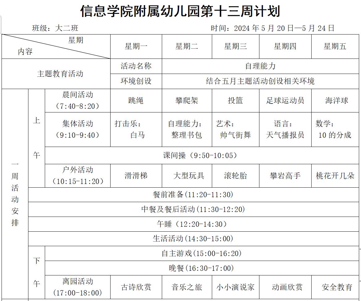 大二班第二学期第十三周计划